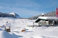 You can explore part of the big loop from parking lot 1. Start at the large flag between the ski school and Welser lift. Alongside the piste, you hike steadily and moderately uphill to the Rosser Hütte. Afterwards, the trail continues comfortably - parallel to the connecting trail - to the Huberhütte and then towards parking lot 3. Here you have to cross the piste and lift track - please be careful! Now you can decide how you want to go downhill: either on foot or on the toboggan run back to the parking lot!