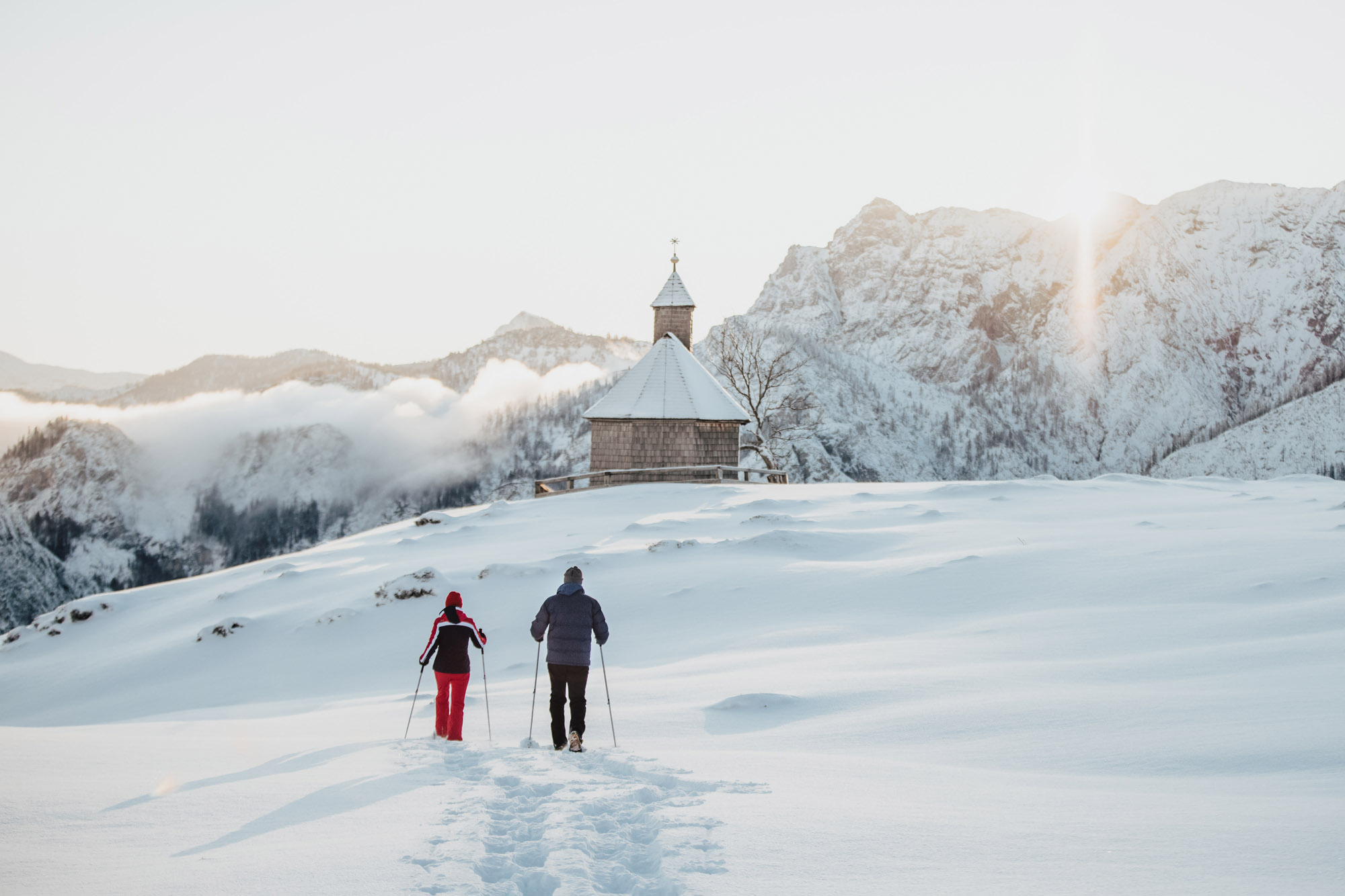 Auch abseits der Wanderwege führen zahlreiche Pfade nach oben. Aber nicht vergessen: Wetterlage und Ausrüstung prüfen! Schneeschuhe sind hier empfohlen. Ausgehend von der Wiesleralm lohnt sich zum Beispiel der familientaugliche Aufstieg über beschneite Almwiesen zum aussichtsreichen Gipfel des Wieslerhorns. Oben angekommen hat man einen fantastischer Rundumblick auf die Berge des Salzkammerguts, insbesondere die Seeregion rund um den Wolfgangsee. Auch der Windkogel bietet sich als gemütliche Schneeschuhtour an. Über die Wiese geht’s hinauf zum authentisch schiefen Gipfelkreuz. Von hier aus schweift der Blick über die umliegenden Berge und Almen.