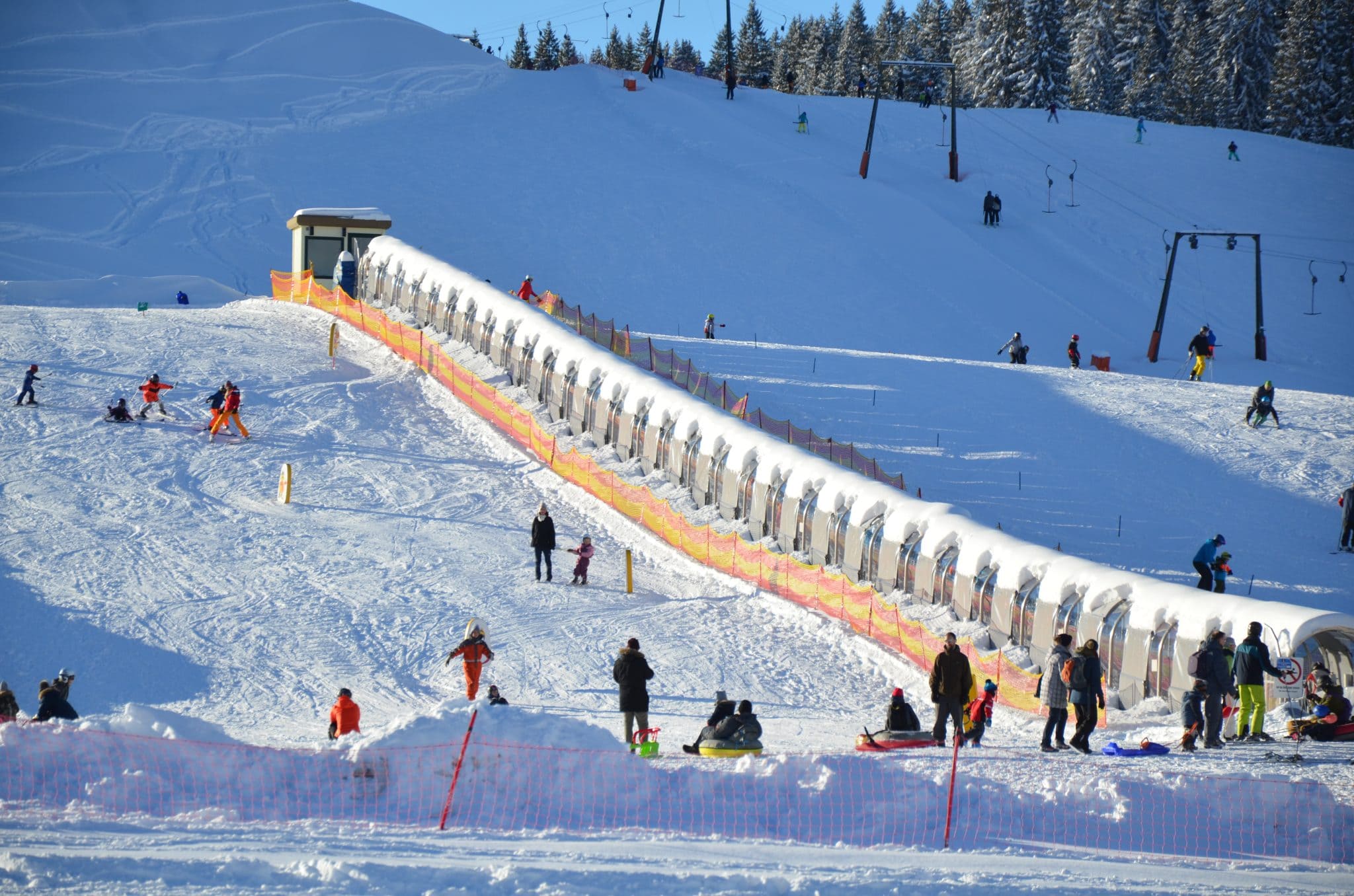 Eine weitere witzige Variante: Mit einem Reifen (Tube) am Zauberteppich den Hang hinauf und anschließend die dafür freigegebene Piste hinabsausen – geht natürlich nur dort, wo Rodeln an der Piste erlaubt ist.